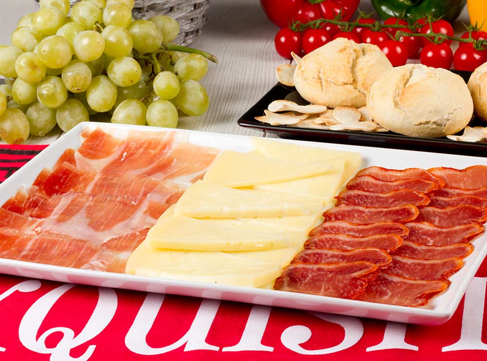 Bandeja surtida con 100 grs de jamón CEBO DE CAMPO, 100 grs de lomo de cebo, 250 grs de queso puro de oveja