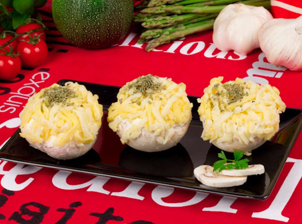 1 champiñón relleno con crema de york casera, crema de queso, PREPARACIÓN En 180º en el horno unos 20 minutos. ALÉRGENOS : GLUTEN, LECHE, QUESO y SULFITO.